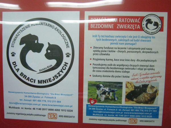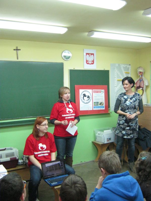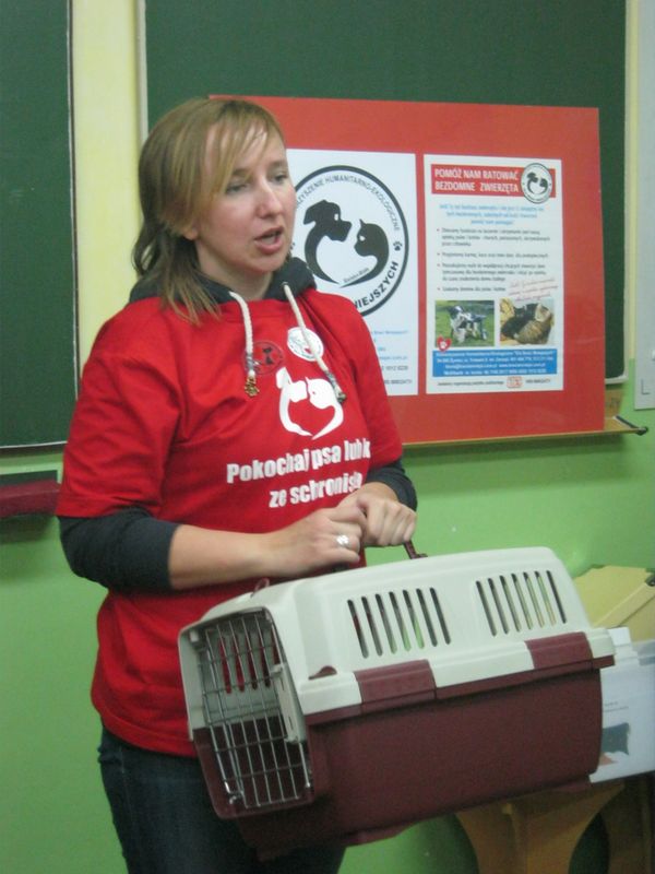 23 października zapoznaliśmy się z zasadami działania Stowarzyszenia Humanitarno-Ekologicznego "Dla Braci Mniejszych". Poznaliśmy nową ideę niesienia pomocy zwięrzętom - zakładanie tzw. "domów tymaczasowych" dla nieszczęśliwych zwierząt, wyrzuconych przez właścicieli na bruk, zwierząt, które uległy wypadkom drogowym. Przypomnielismy sobie, jak nalezy odpowiednio opiekować się naszymi psami i kotami.