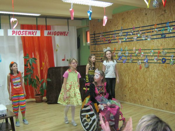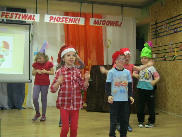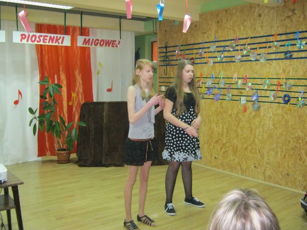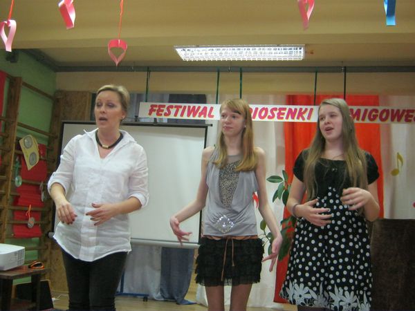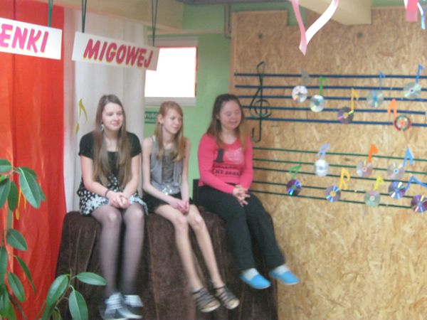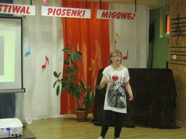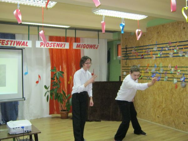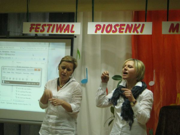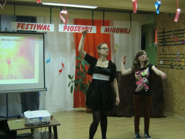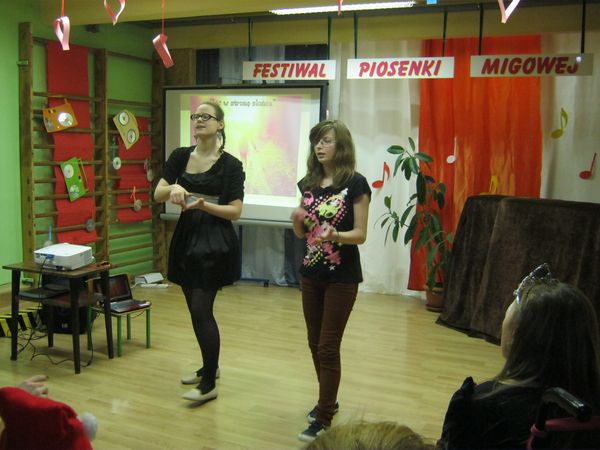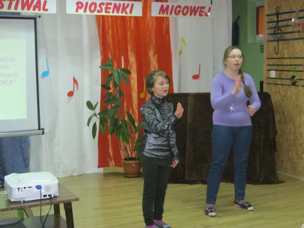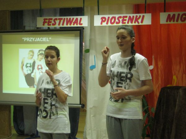 O godzinie 11.00 spotkaliśmy się wszyscy w sali gimnastycznej na II Festiwalu Piosenki Migowej. Cóż to był za festiwal! Mogliśmy wysłuchać i bawić sie przy różnorodnej muzyce - od wesołych i dziecięcych "Krasnoludków" aż po poważne piosenki o przyjaźni. Nasi koledzy i koleżanki, którzy w języku migowym prezentowali piosenki włożyli naprawdę bardzo dużo pracy w ich przygotowanie. Bawiliśmy się super!