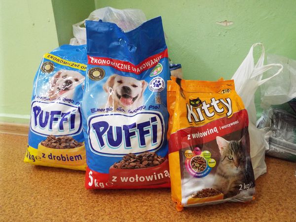 Udało się nam zebrać miski, koce, obroże, smycze, konserwy oraz 35kg karmy.