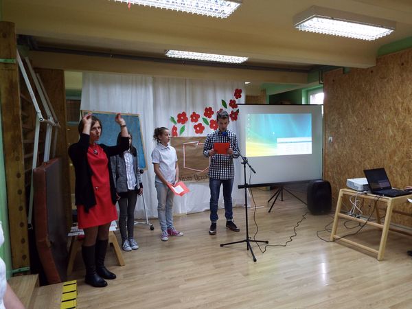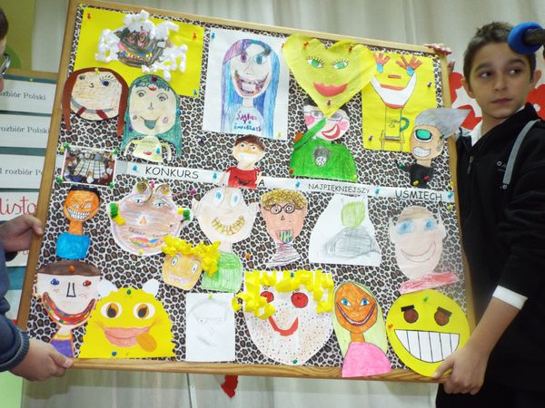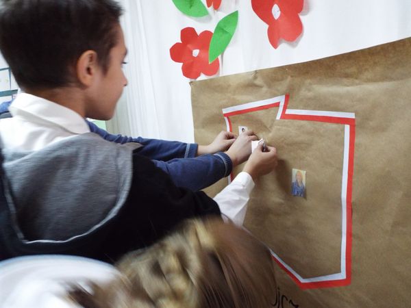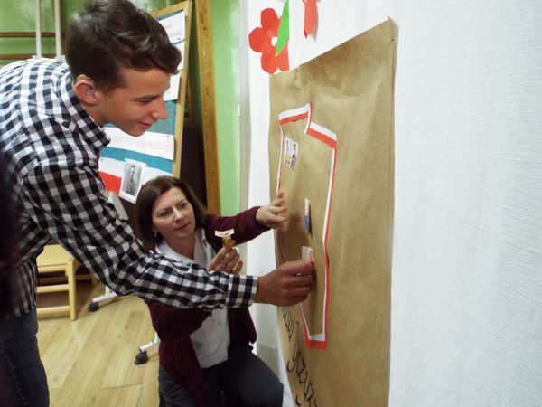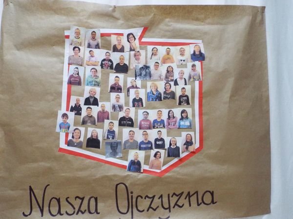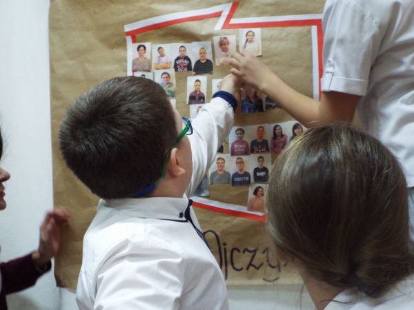 Na środku sali królowała mapa Polski ze zdjęciami wszystkich uczniów, nauczycieli i pracowników szkoły, bo wszyscy jesteśmy Polakami i Polkami.