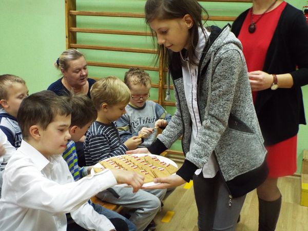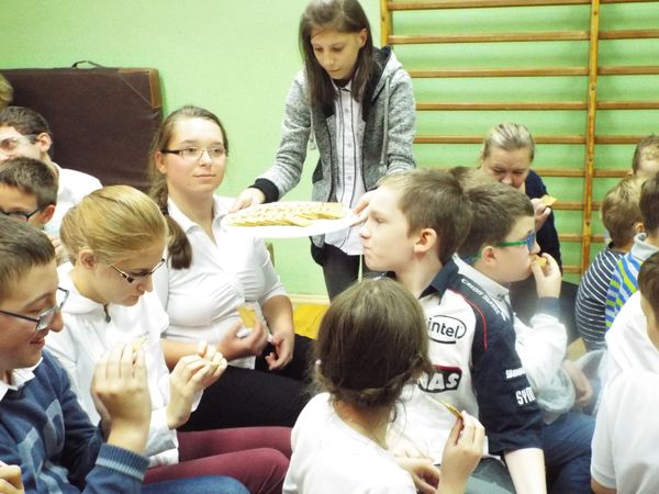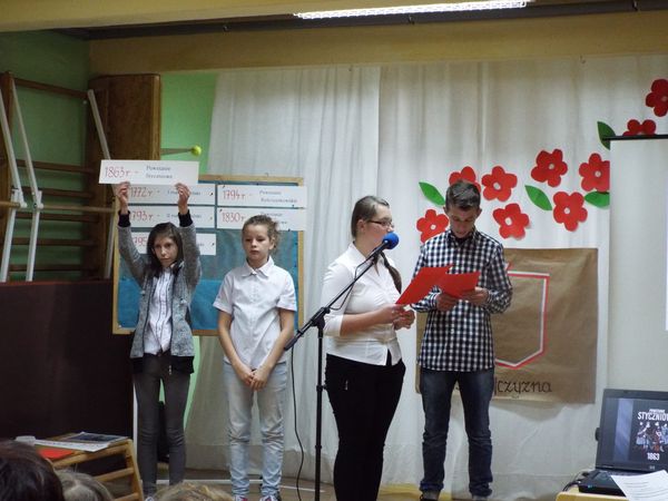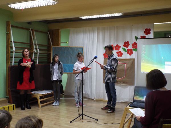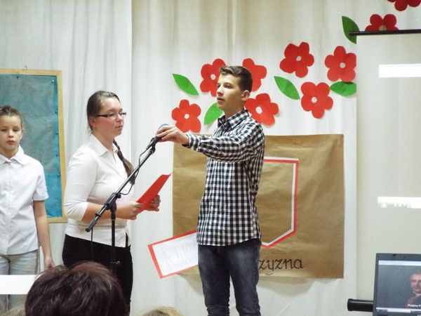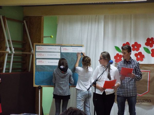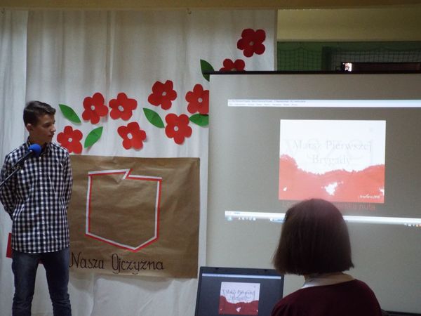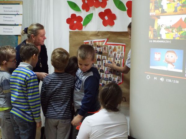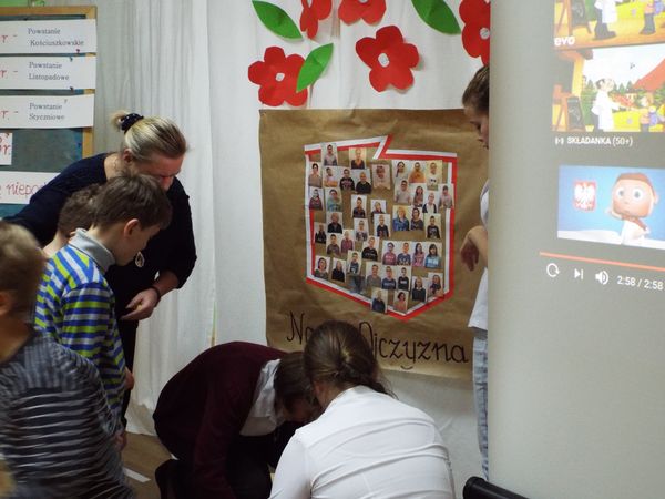 Akademia z okazji Święta Niepodległości odbyła się w naszej szkole 10 listopada. Najpierw odśpiewaliśmy hymn Polski. Potem Weronika, Emilia, Aga i Szymon przypomnieli wiadomości o historii naszej ojczyzny. Następnie Aga przypinała kartki z datą rozbiorów Polski i powstaniach polskich Oglądaliśmy film o trzech rozbiorach Polski. Mówiliśmy o odważnych powstańcach walczących o wolność Polski z zaborcami. Oglądaliśmy film o legionistach I Brygady i słuchaliśmy piosenki ,,My Pierwsza Brygada,,. Polski nie było na mapach Europy przez 123 lata !! Dopiero 11 listopada w roku 1918 odzyskała Niepodległość. Potem była piosenka o wolnej Polsce i krótki film o rozwoju Polski. Z panią Ewą Wresiło uczyliśmy się migać i śpiewać piosenkę. Na końcu Szymon zaprosił na degustację ,,patriotycznych herbatników.