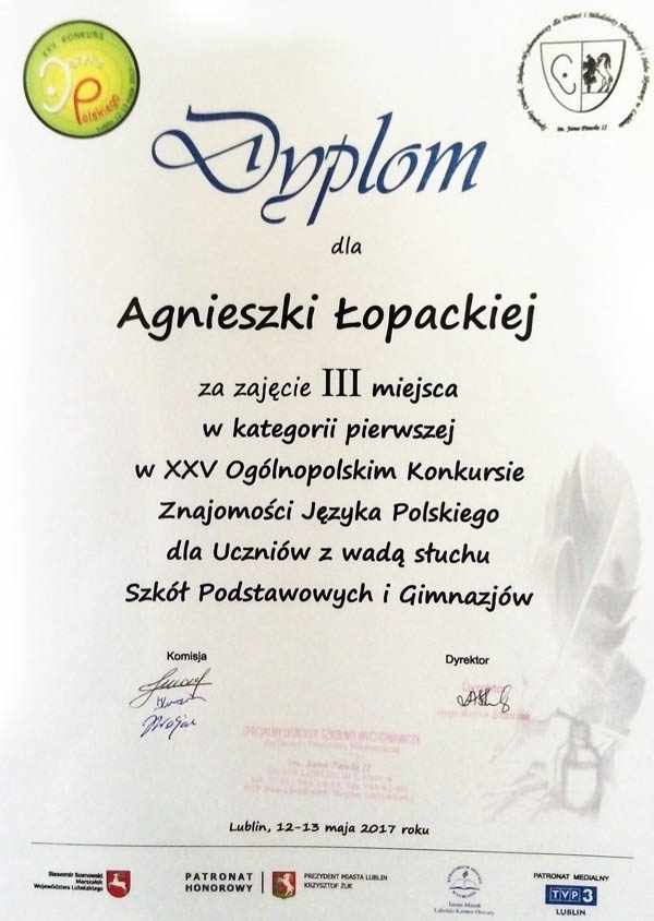 Reprezentantami naszej szkoły byli: Weronika Krajewska i Szymon Sapeta z kl. II gim. Agnieszka Łopacka z kl. VI oraz Miłosz Pasierbek z kl. V.