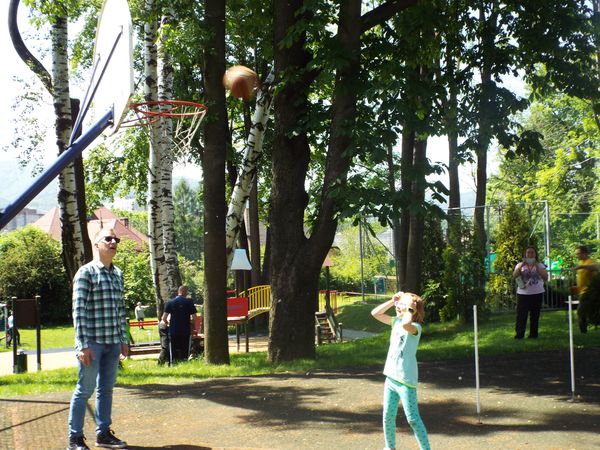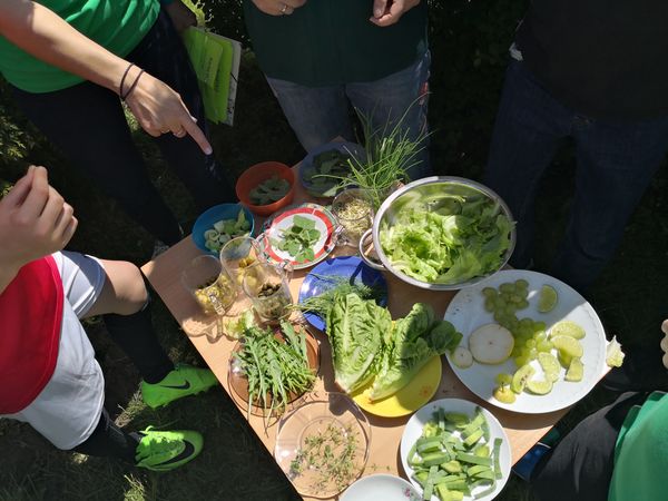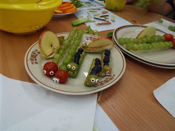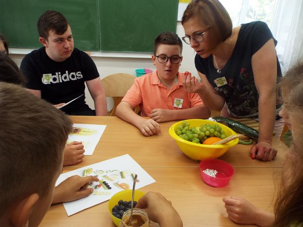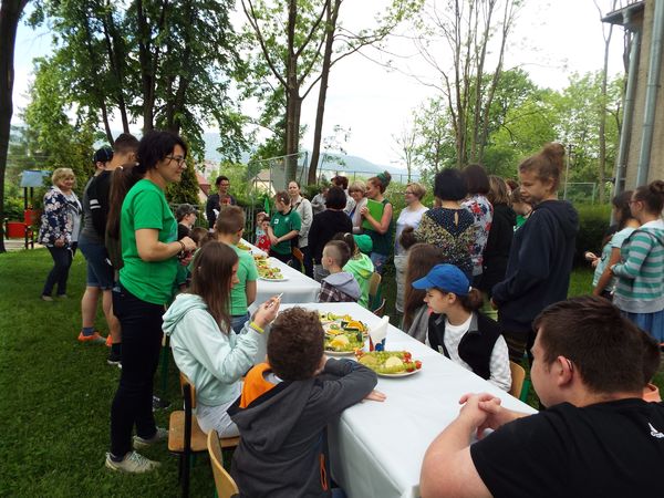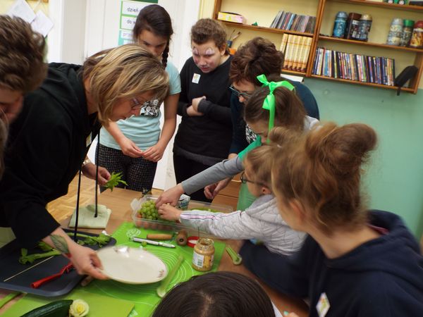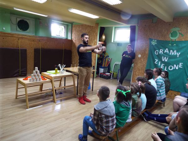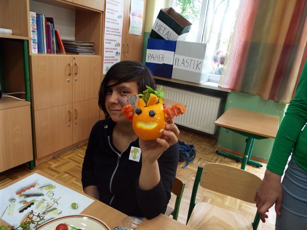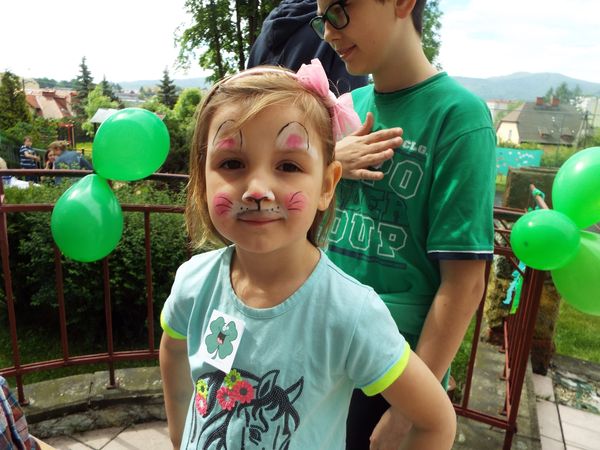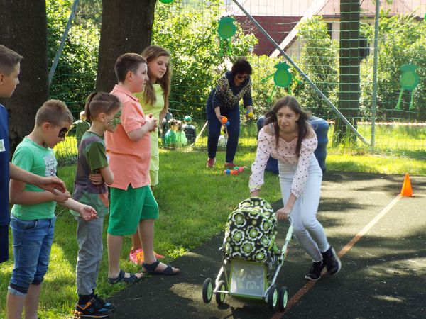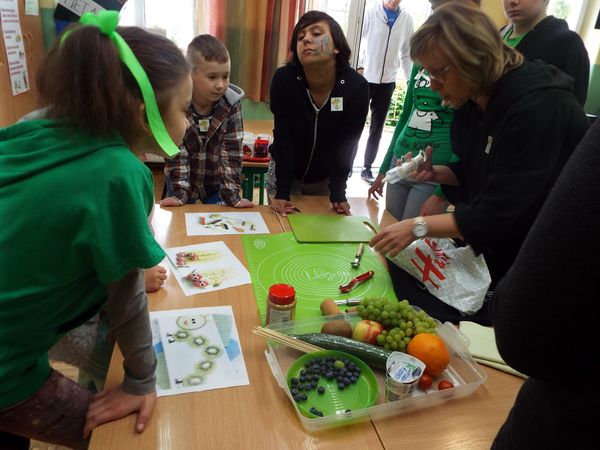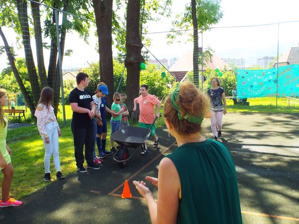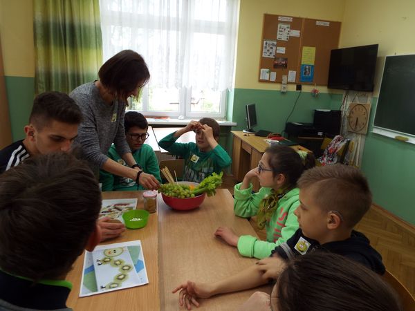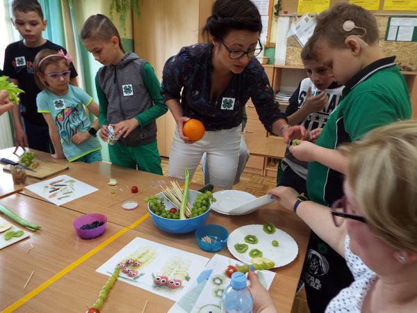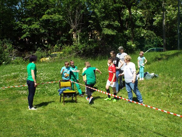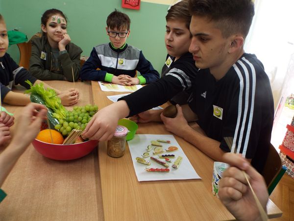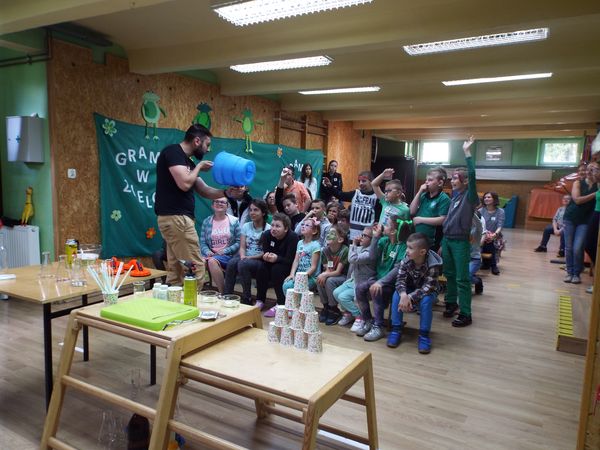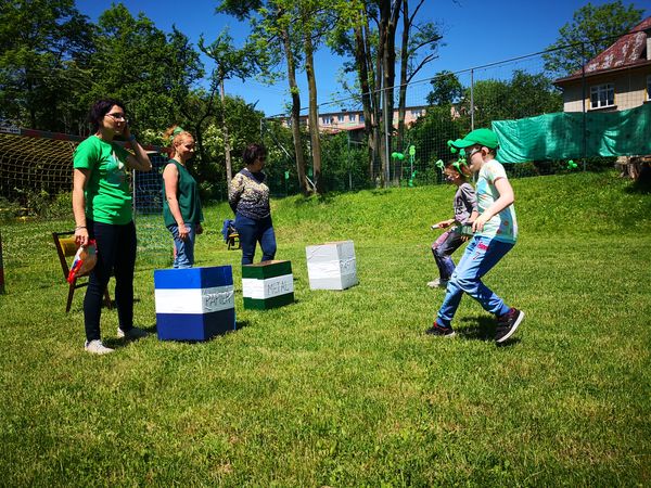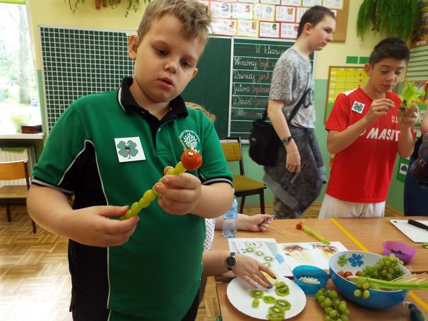 Później zostaliśmy podzieleni na cztery zielone grupy: selerów naciowych, jabłek, koniczyny i winogron. Każda grupa ze swoimi opiekunami brała udział w różnych zabawach, konkursach i konkurencjach sportowych. Były sztafety, biegi z taczkami, rzuty do kosza i wiele innych ciekawych atrakcji. Były też zielone potrawy, które mogliśmy popróbować.