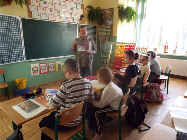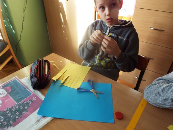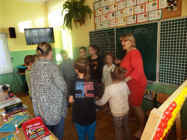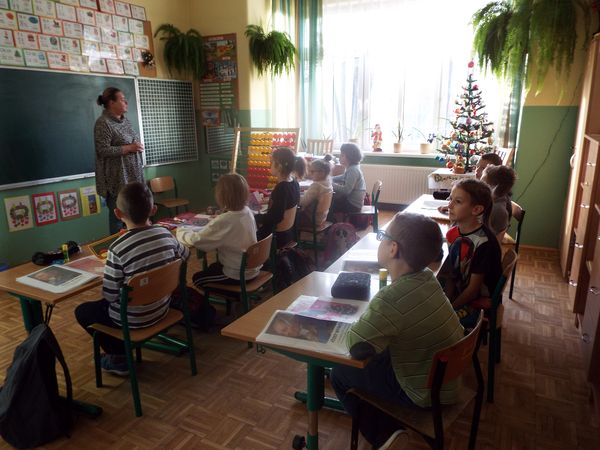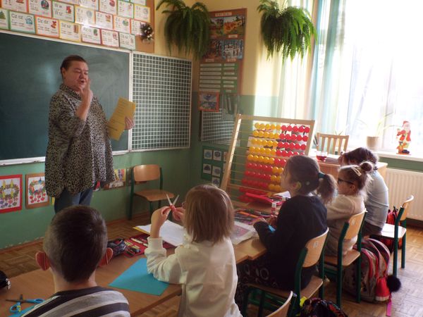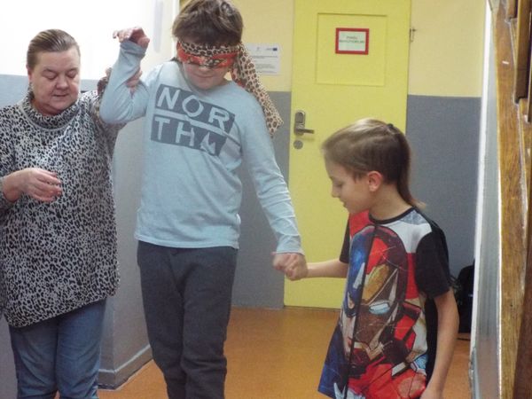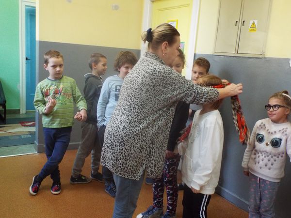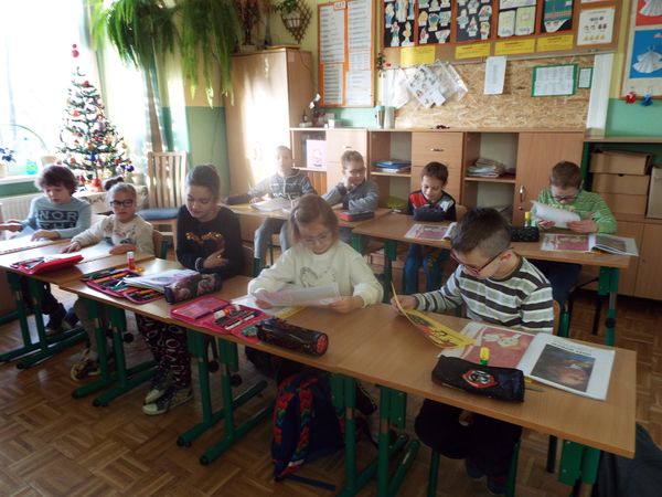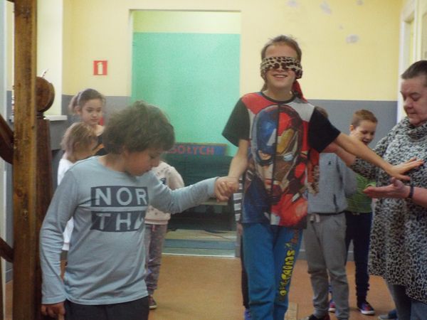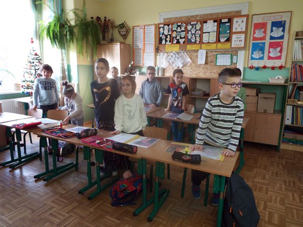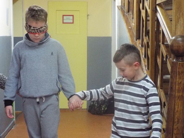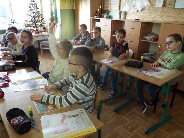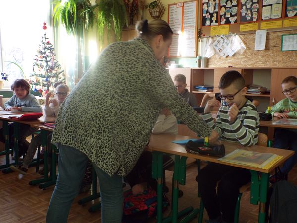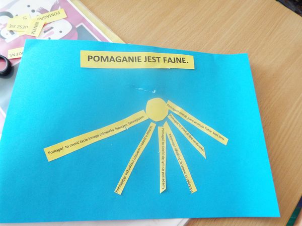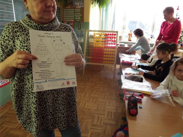 W dniu 16.12.2019 r. przeprowadzono 2 lekcje w klasach I-III af oraz klasie II ns w ramach projektu „Dzieci uczą rodziców”. Temat lekcji – Pomocne serce. W zajęciach brało udział 9 uczniów. Podczas zajęć uczniowie przeprowadzili doświadczenie na ławeczce gimnastycznej (po połączeniu się w pary mieli za zadanie wzajemne przeprowadzenie się po ławce z zawiązanymi oczami). Doświadczenie miało na celu uzmysłowienie uczniom: Co jest lepsze? Czy pomagać innym, czy też korzystać z pomocy? Uczniowie prawidłowo odczytali sygnały i wyciągnęli wnioski. Następnie przeprowadzono burzę mózgów: Na czym polega pomoc? Dlaczego należy pomagać innym? Jak możemy pomóc innym? Potem wspólnie w kole zaśpiewano piosenkę „Pomagam, bo lubię”. Na zakończenie zajęć każdy z uczniów wykonał plakat zatytułowany „Pomaganie jest fajne”. Na niebieskiej kartce symbolizującej niebo nakleił żółte koło oraz promienie słoneczne na których wypisał, dlaczego należy pomagać. Jako zadanie do domu uczniowie otrzymali obrazek do pokolorowania wspólnie z rodzicami.