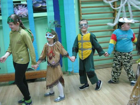balu karnawałowo-walentynkowym. W tym roku, dzięki paniom opiekunkom szkolnego samorządu, „gościliśmy” na dnie oceanu, w podwodnych głębinach. Swoją obecnością zaszczyciła nas królewska para: sam Neptun – król mórz i oceanów (to - jak zwykle wspaniale przebrany - Kuba z klasy I gimnazjum)