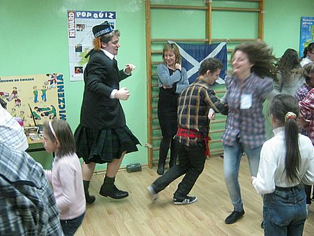 Nietypowe wydarzenie miało miejsce w naszej szkole 25 lutego. Pani Monika – nasza nauczycielka języka angielskiego - przygotowała obchody Dnia Szkockiego, na które zaprosiła Szkota w oryginalnym, regionalnym stroju. Pan Kyle opowiadał nam o tradycjach i kulturze Szkocji, pokazywał zdjęcia i tańce szkockie. Największą atrakcja była nauka takiego tańca, w którą zaangażowali się i uczniowie i nauczyciele. Bawiliśmy się świetnie, a przy okazji wiele się dowiedzieliśmy o Szkocji.