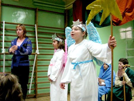Jak co roku, tak i tym razem w naszej szkole odbyło się wspólne spotkanie wigilijne. Uczniowie z najmłodszych klas pod okiem pani Ewy Mazur przygotowali urocze przedstawienie jasełkowe, połączone ze wspólnym kolędowaniem. Pani Asia (ta od migowego) i pan Marcin (nauczyciel muzyki) zadbali o to, byśmy kolędy śpiewali i migali jak najpiękniej.