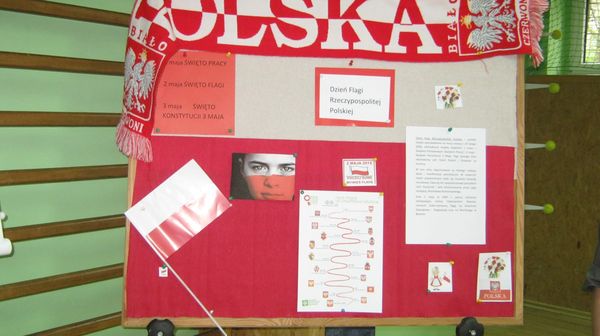 Z okazji zbliżającego się Święta Pracy, Święta Konstytucji a przede wszystkim Święta Flagi, spotkaliśmy się w sali gimnastycznej, na okolicznościowej akademii, na której obejrzeliśmy prezentację, związaną z tym świętem. Później pani Monika Zaremba zorganizowała dla nas warsztaty, podczas których wykonywaliśmy biało-czerwoną biżuterię.