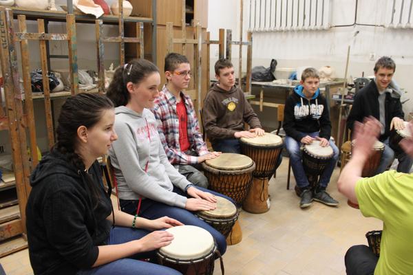 Wspólnie z uczniami z Zespołu Szkół Plastycznych wykonywaliśmy maski karnawałowe. Mieliśmy wiele pomysłów i w efekcie powstały wspaniałe prace: złote maski weneckie, stylowe afrykańskie, kolorowe, szokujące i zachwycające maski. Można je było potem obejrzeć na wystawie znajdującej się w korytarzu budynku liceum plastycznego a obecnie zdobią naszą szkołę. Po warsztatach plastycznych zaproszono nas na ucztę muzyczną. Wysłuchaliśmy koncertu bębniarek grających pod kierunkiem pana Tadeusza Kóski. Mogliśmy również sami usiąść przy instrumentach i pobawić się rytmami. Dzięki temu, że przebywaliśmy w pracowni rzeźby, mieliśmy możliwość zaobserwowania młodych artystów przy pracy. Zobaczyliśmy jak wiele wysiłku i pasji wkładają w naukę. Dzięki życzliwości pani Barbary Mydło i jej uczniów czuliśmy się tak dobrze, jak w swojej szkole, za co serdecznie dziękujemy. Ten dzień pozostanie na długo w naszej pamięci.